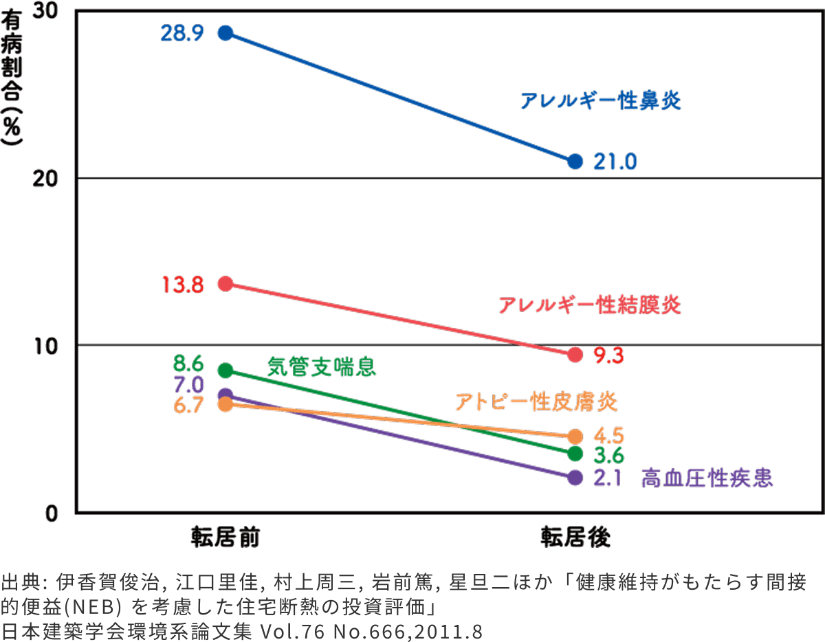 ※結露減少によるカビ・ダニ発生改善、暖房方式の改善と24時間機械換気による室内空気質改善、遮音性能改善、新築住宅への転居による心理面での改善等の複合効果と考えられます。