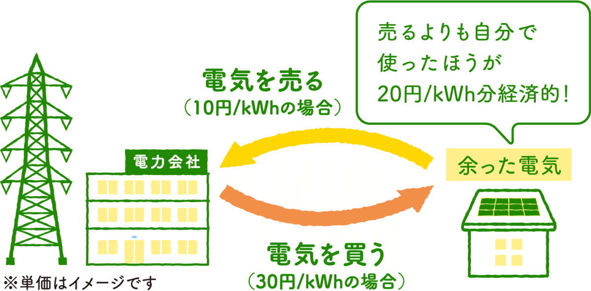 家庭での電力消費量は、一般的に夜間にピークを迎えます。一方、太陽光パネルによる発電量のピークは、日射の多い昼間となるため、発電した電気を家庭で使いきれないことがあります。余った電気は、電力会社に売ることもできますが、売る時の単価が買う時の単価よりも低い場合は、自身で使った方が経済的です。