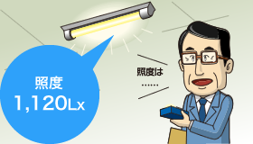 照度を測定したところ1,120Lxありました。東京都では500Lxを推奨しています。推奨照度は500Lxですが、まずは5割ほど間引きを行い、電力使用量の削減を図ります。