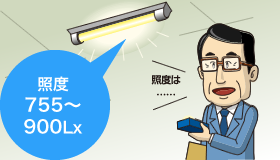 照度を測定したところ755Lxから900Lxありました。東京都では事務所の照度は500Lxを推奨しています。推奨照度に近づけるよう蛍光灯を間引きすることにより、照明の電力使用量を削減することができます。