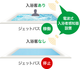 電波式入浴者感知器を浴槽近辺に設置しブロア、ポンプ9台の運転を制御することにより電力削減を行います。