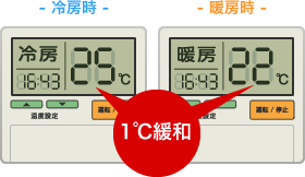 エアコンの設定温度をそれぞれ1℃緩和し消費電力の削減を図ります。1℃の緩和により空調負荷(空調消費電力)を約10%削減出来ると想定します。