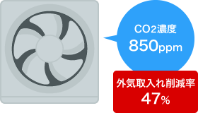 室内環境測定記録によるCO2濃度をもとに、外気ファンのダンパー開度の調節により最適な換気量で運転し、空調負荷の削減を図ります。
