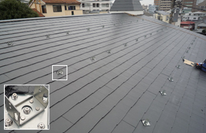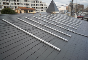 架台を支えるための金具を取り付けます。屋根材に穴をあけ、コーキング材や防水シートで充分な防水処置をしたうえで、垂木や野地板に固定します。