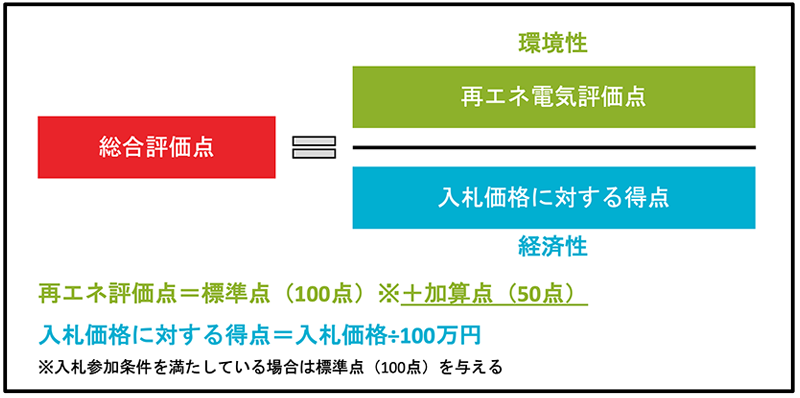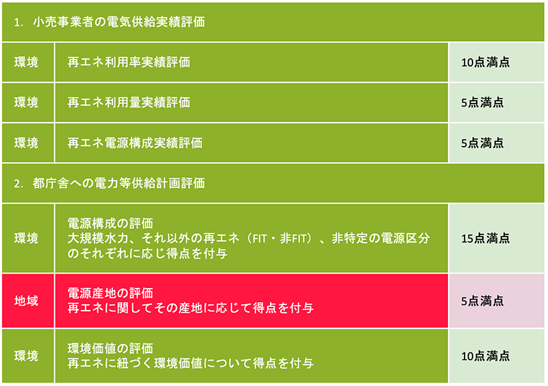 都庁舎版RE100(東京都庁舎で使用する再生可能エネルギー電気の需給(単価契約))で実際に使用された総合評価の内容です。