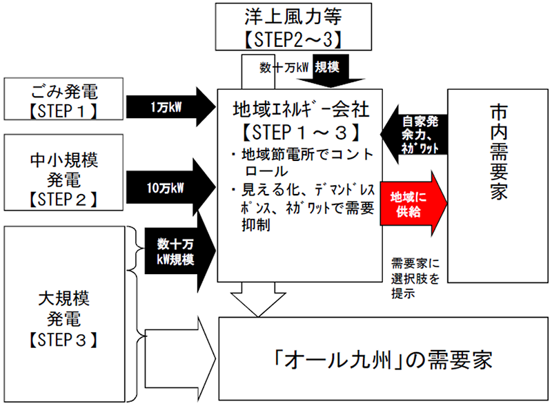 2013年、北九州市新成長戦略の主要プロジェクトとして、低炭素で安定・安価なエネルギーを供給することを目指し、「北九州市地域エネルギー拠点化推進事業」を実施。同事業の推進会議取りまとめにおいて、「新電力のみの利益でなく、地域全体の利益を追求するために、新電力の登場を待つのではなく、地域エネルギー会社を設立し、そこが役目を果たすことが必要」としている。これに基づき、2015年12月に同市と民間事業者の共同出資(市出資率:約25%)で㈱北九州パワーを設立。2016年の営業開始に合わせて、市有施設の大半が電力を切替えた。