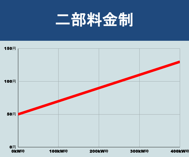 東電など東日本の電力会社と中部電力、九州電力が採用している。基本料金と電力使用量料金で構成される。標準メニューでは「3段階料金」が取られており、0~120kWh、120~300kWh、300kWh以上で単価が変わる。使用電力量が少ないほど単価が安いため、省エネインセンティブが発揮される料金体系。