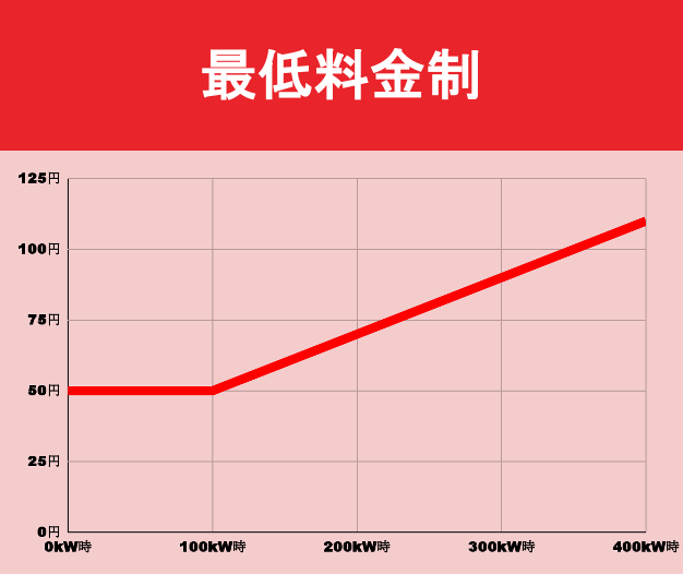 中部電力・九州電力を除く西日本の電力会社で採用されている料金体系。一定使用量(関電では最初の15kWh)までを最低料金として定額料金を設定し、以降は二部料金制と同じく3段階の従量料金単価を設定する。東電EPも自由化後にこの料金体系を電力量料金部分に組込み(基本料金も別途掛かる)、400kWhを超える使用量がお得になる家庭向けメニューを提供している。