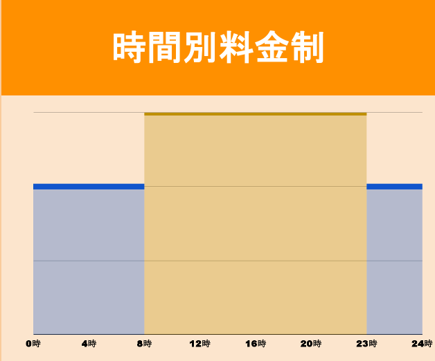 電力の使用時間帯によって、電力量料金単価を変動させる料金体系。多くの場合、夜間の単価が安く、昼間は夜間よりも高い単価で3段階料金が取られている。例えば蓄電設備やエコキュートなどの夜間蓄熱式機器がある場合、夜間の安い単価で蓄電・蓄熱し、昼間に使用することで料金削減を図れる。