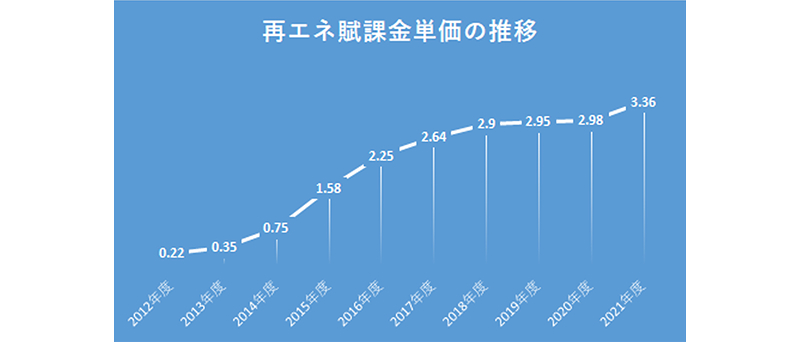 賦課金単価は国の委員会にて年ごとに決定し、毎年5月から新単価に移行する。再エネ普及が進むにつれ、年々単価は上昇している。