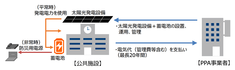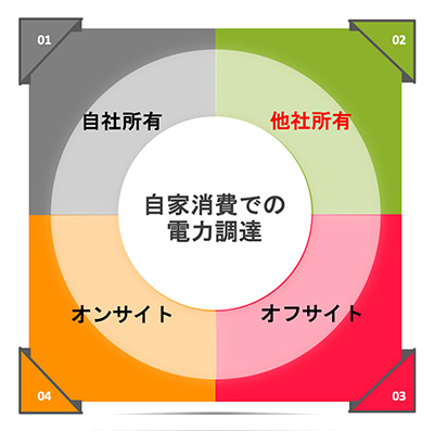 PPA(Power Purchase Agreement:電力購入契約)とは、設備設置事業者が施設に太陽光発電設備を設置し、施設側は発電した電気を購入する契約方式のことです。「屋根貸し自家消費型モデル」や「第三者所有モデル」とも呼ばれ、施設側は設備を所有しないため、設備投資や維持管理に係る負担を軽減しながら、再エネ電力の自家消費が実現できます。