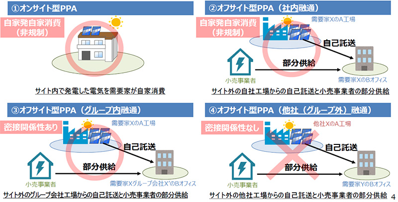オフサイトでのPPAは自己託送制度を利用して実現できる。自己託送制度では、発電所の所有者と需要家の間で「密接な関係」が認められる必要があるため、自社またはグループ会社の所有する施設や土地で発電設備を設置でき、別地点の需要施設でその電力を使用したい場合の手段となる。また計画値同時同量が求められるため、発電量・需要量の予測が必要となり、実績値との間で不足があれば、一般送配電事業者に補填してもらった電力量の料金(インバランス料金)を支払う。左の横浜市の事例では、オンサイトの余剰分を他施設へ自己託送し地産地消率を上げる全国初の試みを実施予定。