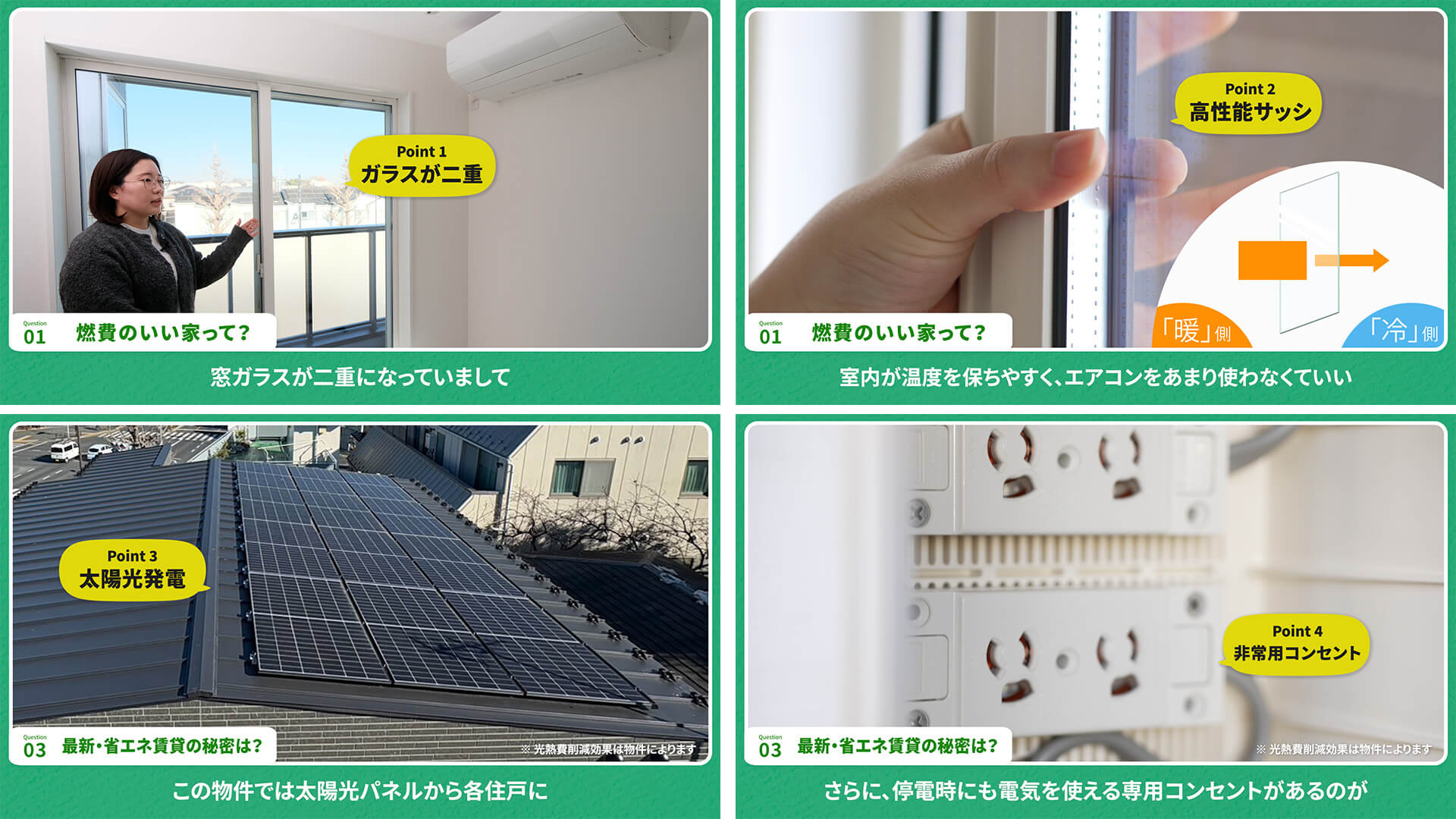 もちろん、従来の物件と比べて光熱費を抑えられるのも、燃費のいい家のメリット。「LED照明や節湯ができる水栓、高性能の給湯器やエアコンなど、省エネルギーに配慮した設備が備わっていれば、光熱費をさらに削減できます」。加えて、太陽光パネルが設置され、発電した電気を入居者が使用できる物件を選べば、より効果が実感できます。「各戸に電気を分配していなくても、発電した電力を共用の非常用電源として停電時に利用できることもあります。災害時に役立つ仕組みが整えられているケースが多いことも、こうした物件の特徴といえるでしょう」。
