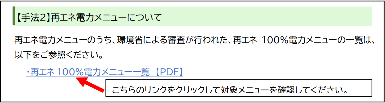 2 環境省のホームページの下図に記載されている「・再エネ100%電力メニュー 一覧」のリンクから対象メニューをご確認ください。