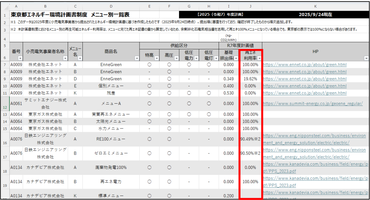 ②「東京都エネルギー環境計画書制度メニュー別一覧表」において「計画値」の「再エネ利用率」が100%であるメニュー