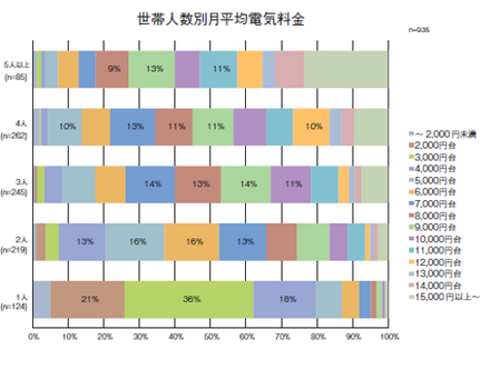 世帯別に最も多い金額帯は、1人世帯は3,000円台が36%、2人世帯は5,000円、6,000円台がそれぞれ16%、3人世帯は7,000円、9,000円台がそれぞれ14%、4人世帯は7,000円台が13%となり、世帯人数が増えると月平均電気料金が高くなるものの、世帯数が同じ場合でも平均電気料金には差がある結果となった。