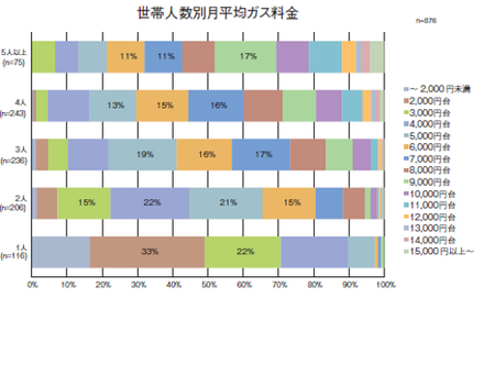 世帯別に最も多い金額帯は、1人世帯は2,000円台が33%、2人世帯は4,000円台が22%、3人世帯は5,000円台が19%、4人世帯は7,000円台が16%となり、世帯人数が増えると月平均ガス料金が高くなるものの、世帯数が同じ場合でも平均ガス料金は差がある結果となった。