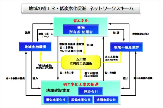 神宮 地域の省エネ・低炭素化のネットワークを充実させていきたいですね。立川市と立川商工会議所は協力関係にありますし、市内には商業施設などの大型建物、不動産業、金融機関、電気や設備、造園事業を含めた建設会社もそろっています。建物の省エネ化は建物価値を向上させますから、それに不動産業や建設会社が協力する、また金融機関が「環境配慮型」融資あっせん制度で後押しするなどです。我々は、建物別・業種別の省エネ情報を提供したり、相談窓口となったりする。クレジット創出の支援もできます。これらのステークホルダー間の連携をもっと進めていきたいのです。