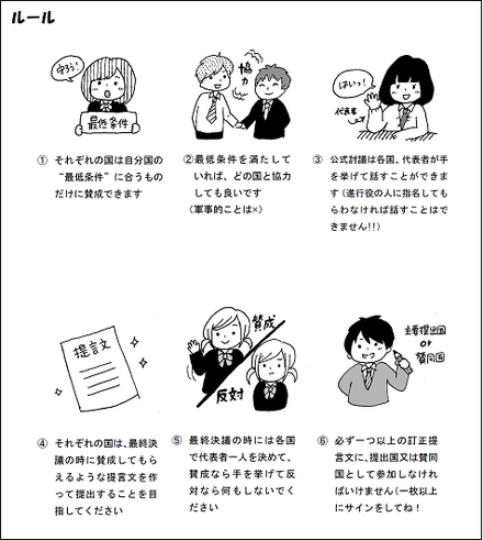 澁谷 COP会議において京都議定書に代わる新たな提言が国際会議に提出されたと仮定して、その提言文を巡ってそれぞれ自分の国の立場に立って意見調整を進めるのです*1。生徒を9つの国に分けてその国の代表になってもらいます。自国にはそれぞれ賛同するための最低条件があり、その条件をクリアしなければ賛同することができないようにしてあります。