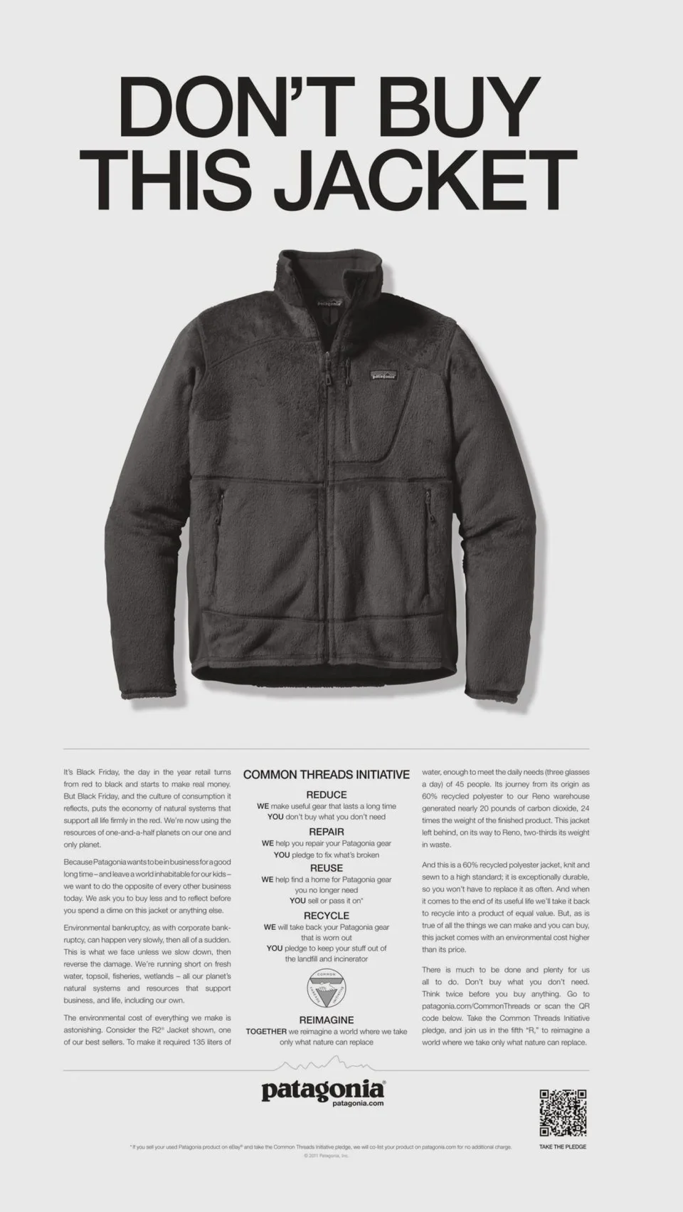 篠 そうですね、これからも健全なビジネスを存続させるためにも、利益と、環境や地域社会を含むステークホルダーの便益の両方の面を考えて事業運営を行っています。例えば、2011年には「Don’t Buy This Jacket(このジャケットを買わないで)」という広告を出しました。その背景には洋服が短期間で買って、捨てられるファッション産業の問題を提起するため、お客様にも今から購入しようとしている商品が本当に必要かどうか考えてほしいというメッセージとして発信しました。