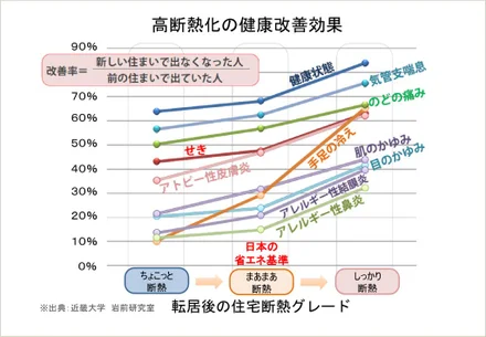 清水: 近畿大学の岩前先生の有名な研究がありまして、断熱性が高い家に引っ越していくと病気が改善方向に向かうんです。断熱性が高く冬でも暖かい家に住むと健康に良くなる、しかも断熱性が高ければ高いほど、その効果が顕著に現れるんです。
