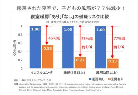 清水: そうですね。もう1つ、暖房を止めて寝た子どもと、朝までつけた子どもの風邪をひく確率などを調査した、産業医科大学の藤野先生らの研究結果をご紹介しますね。
