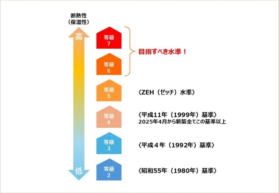 清水: 一方、これから新しいお宅を建てる方、国が決めた「断熱等級」というものさしがありまして、このものさしを参考にしてください。少ないエネルギーで家中を快適にするには、断熱等級6以上を目指してほしいんです。今、私たちがいるこのお宅の断熱等級は6.5ぐらい、7に非常に近い断熱性が高い住宅なので、冬暖かいだけじゃなく夏もエアコン1台で快適に過ごすことができます。ぜひ断熱等級に着目してみてください。