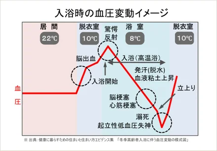 暖かい居間から寒い浴室に行くと寒いので、血管がぎゅっと縮み、血圧がぐっと上がります。そこから暖かいお風呂に入ると今度は血管が開きます。血圧が上がったり下がったりすることで、脳梗塞だったり心筋梗塞、そういった病気を発症しやすくなります。また、寒いのでゆっくりお風呂に入っていると、のぼせてきて血管が開いてしまって意識がなくなり、そのまま溺れてしまうんです。