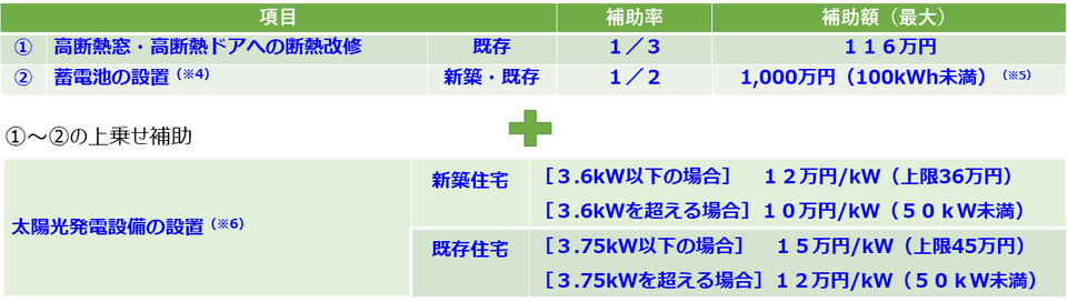 | [太陽光(4kW未満)と蓄電池を併せて設置又は蓄電池のみを設置の場合] 10万円/kWh(最大80万円/戸) | ||