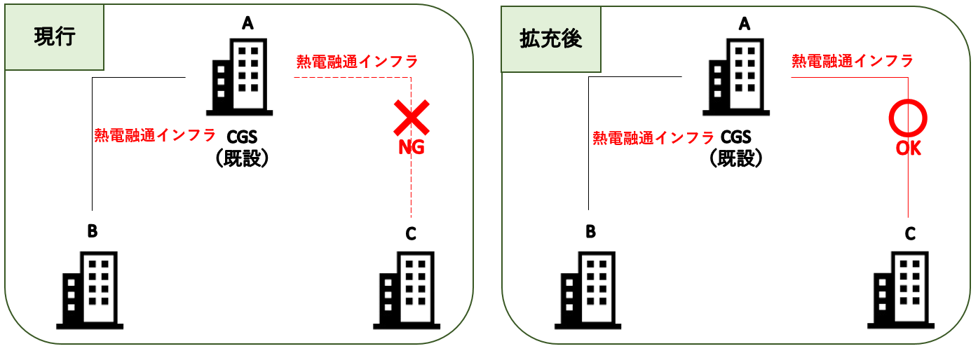 熱電融通インフラを新たに設置し既存のCGSに接続する事業について、既に他の建築物との間で熱又は電気を融通している建築物に接続する場合についても、新たに助成対象とします。