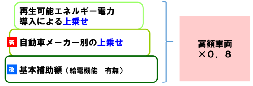 高額車両(税抜840万円以上)については、(1)から(3)までの合計額に0.8を乗じた額を補助額とします。