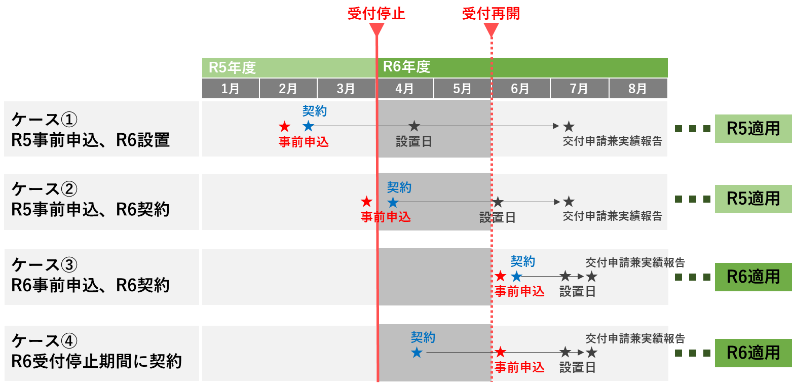 原則、助成対象機器の契約締結前に事前申込が必要ですが、令和6年4月1日から令和6年6月30日までに契約締結、又は契約・工事完了された事業(令和5年度に事前申込をされていない場合に限る。)については、各助成要件への適合を前提に、令和6年度事業の助成対象とする予定です。
