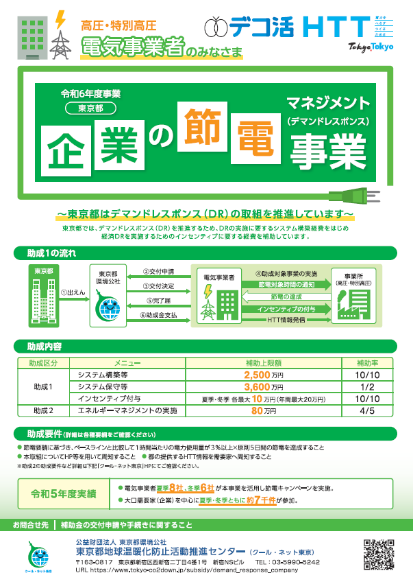 デジタル技術を活用して、タイムリーに節電要請及びインセンティブ付与等を行う電気事業者に対し、その取り組みに必要な経費の一部を助成します。 また、都内の事業所で実施するデマンドレスポンスをより効果的に実施するためのエネルギーマネジメントへの取組に必要な経費の一部を助成します。