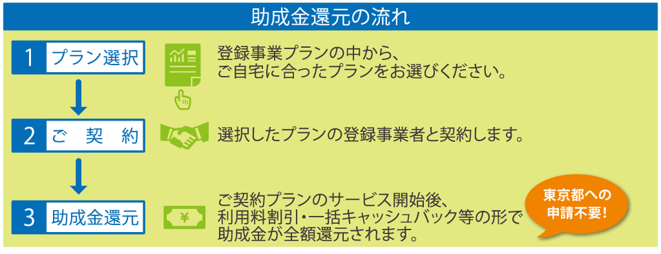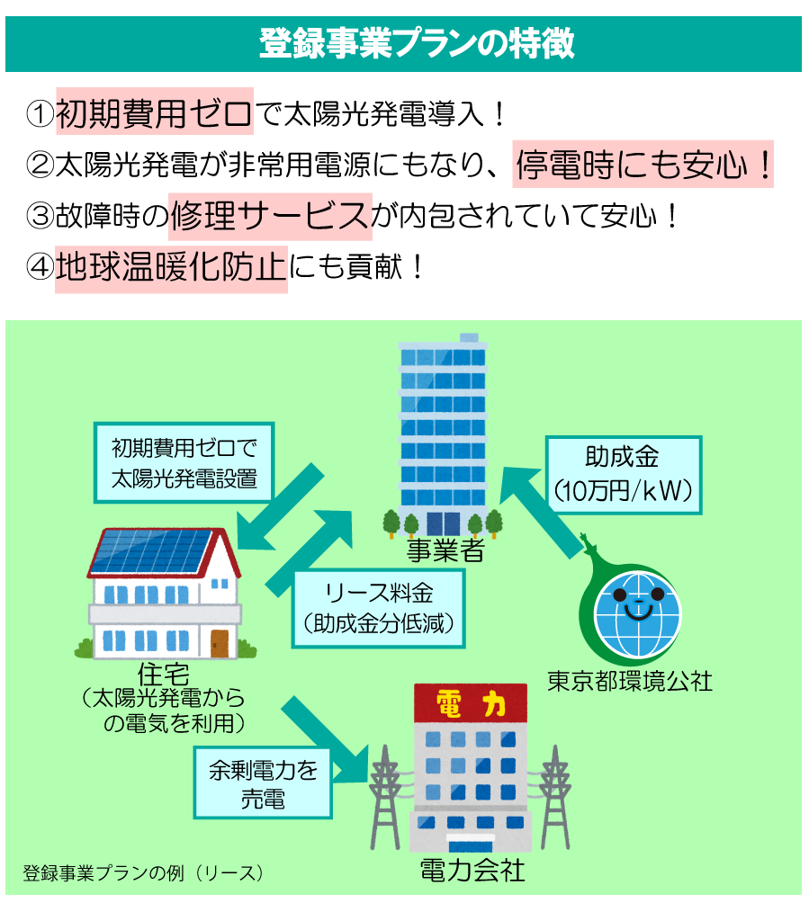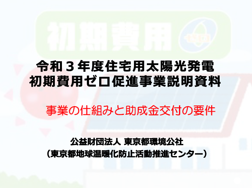 | 助成対象事業 | 住宅所有者の初期費用ゼロで太陽光発電を設置するサービスで、公益財団法人東京都環境公社に登録された事業プラン |