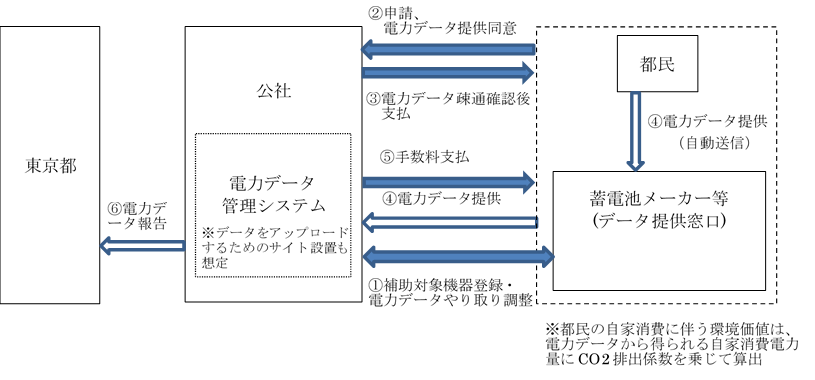 各メーカーのデータ提供窓口が助成対象住宅の電力データ等を公社が構築する電力データ管理システムへアップロードした場合、公社は各家庭の電力データ1件に対して、月あたり100円の手数料を支払う。