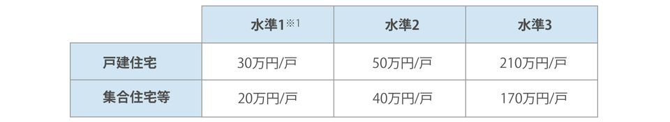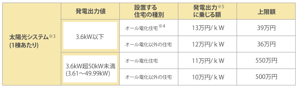 ※5 発電出力値は、太陽電池システムを構成する太陽電池のモジュールの日本産業規格若しくはIECの国際規格に規定されている公称最大出力の合計値とパワーコンディショナーの日本産業規格に基づく定格出力の合計値のうち、いずれか小さい値(kWを単位とし、小数点以下第3位を四捨五入する)とします。なお、上表の額を乗じた結果、千円未満の端数が生じたときは切り捨てます。